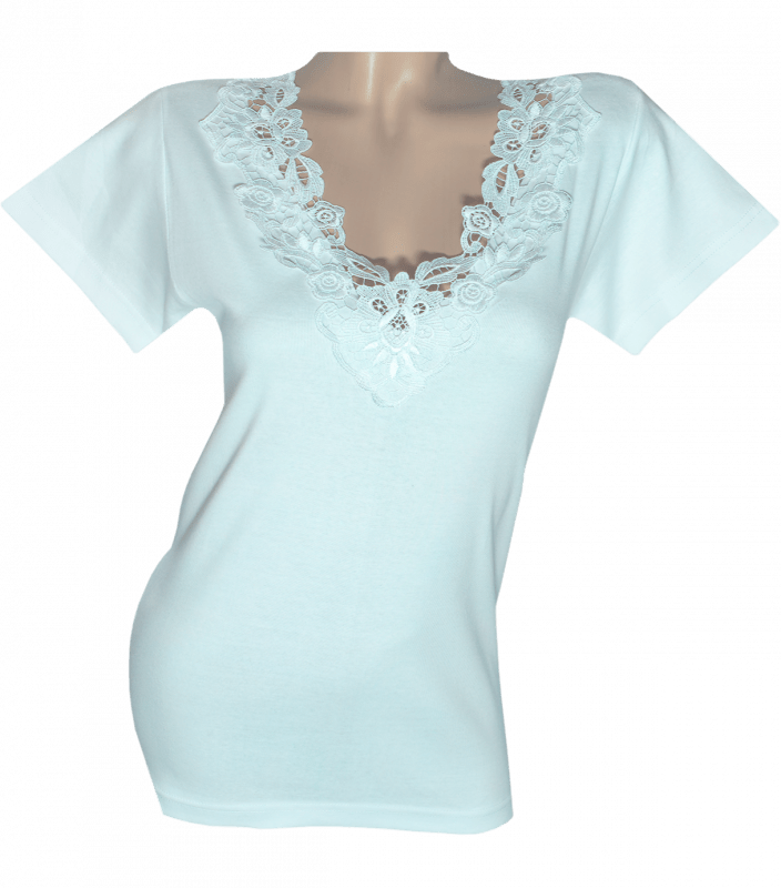 Жіноча футболка з коротким рукавом та V-подібним мереживним вирізом горловини.
