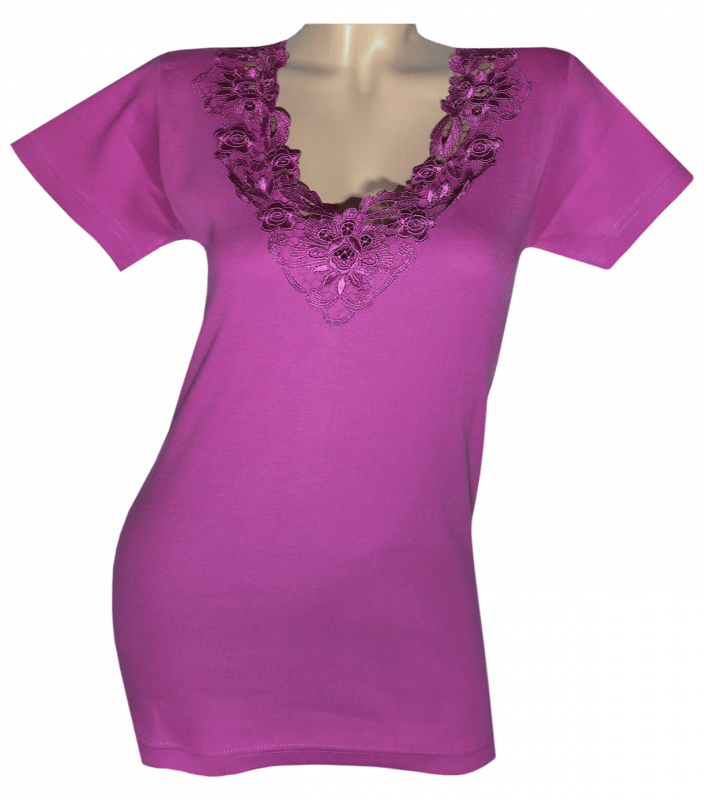 Жіноча футболка з коротким рукавом та V-подібним мереживним вирізом горловини.