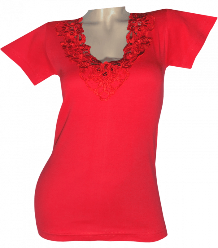 Жіноча футболка з коротким рукавом та V-подібним мереживним вирізом горловини.