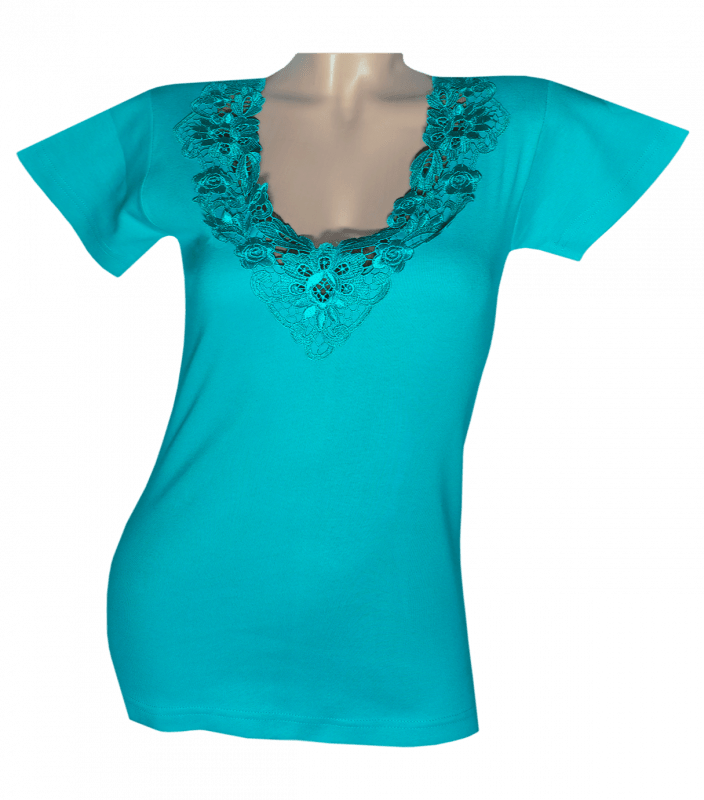 Жіноча футболка з коротким рукавом та V-подібним мереживним вирізом горловини.