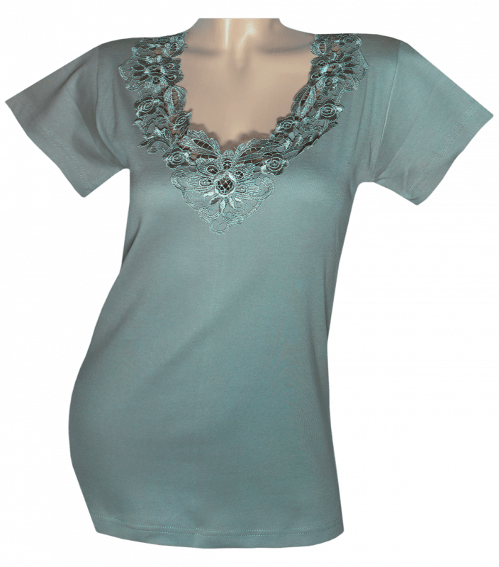 Жіноча футболка з коротким рукавом та V-подібним мереживним вирізом горловини.