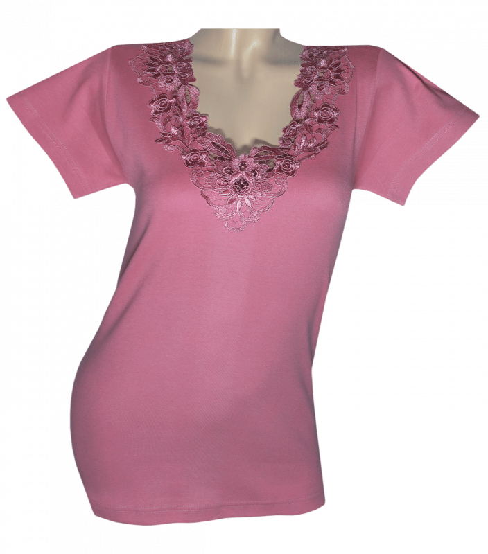 Жіноча футболка з коротким рукавом та V-подібним мереживним вирізом горловини.