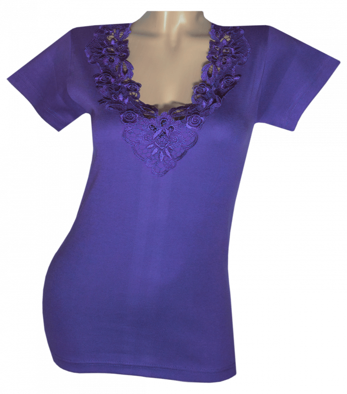 Жіноча футболка з коротким рукавом та V-подібним мереживним вирізом горловини.