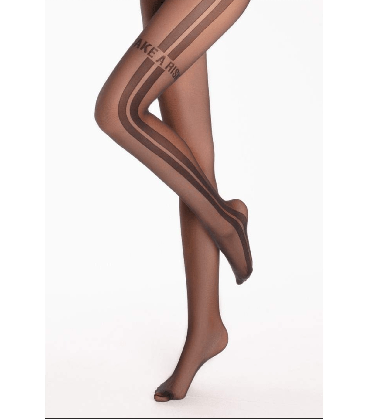 Бокова частина моделі декорована тканим візерунков у вигляді полосок, а вище коліна - напис "TAKE A RISK".