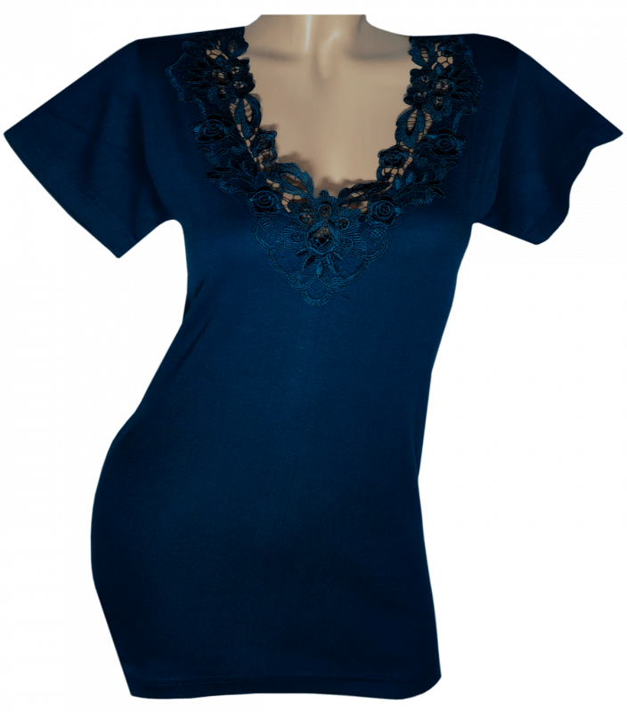 Жіноча футболка з коротким рукавом та V-подібним мереживним вирізом горловини.