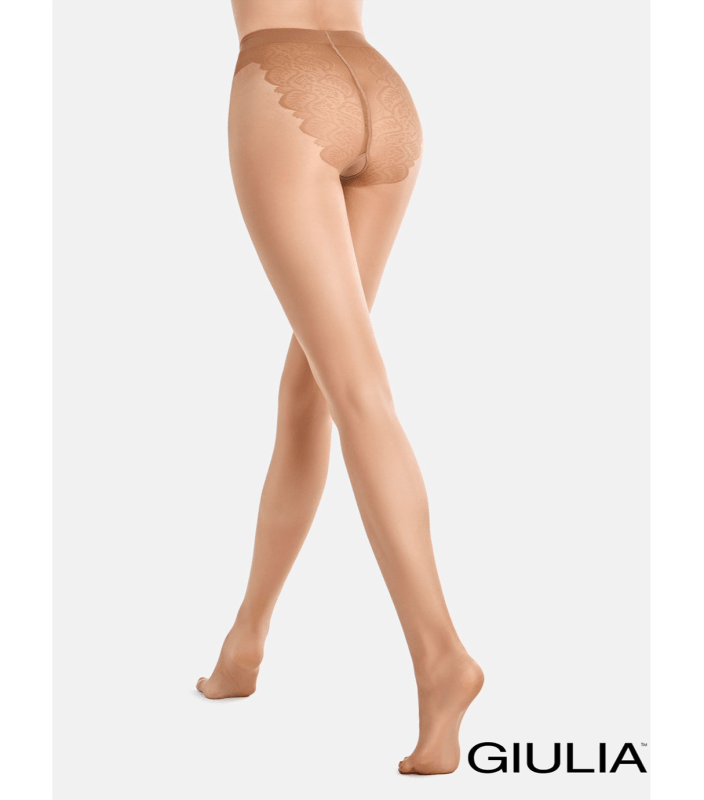 Капронові колготки еластичні, напівматові колготи щільністю 40 DEN виготовлені з поліамідної нитки одинарної обмотки з додаванням еластану, завдяки чому вони прекрасно облягають ніжку і створюють однорідну і рівну поверхню. Виріб прикрашено витонченими мереживними трусиками. Також модель має практичні плоскі шви, а для гігієнічності бавовняну ластовицю