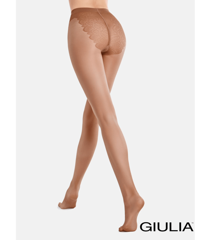 Тонка і еластична модель виготовлена з одинарної обмотки нитки з напівматового полотна високоякісного поліаміду і еластану, прекрасно виглядає на ніжках. Колготи мають оптимальну середню посадку, яка підходить для багатьох видів одягу. А також красиві і витончені ажурні трусики. Для додаткового комфорту виріб виготовлений з зручними і практичними плоскими швами, які практично непомітні, а також має ластовицю з бавовни.