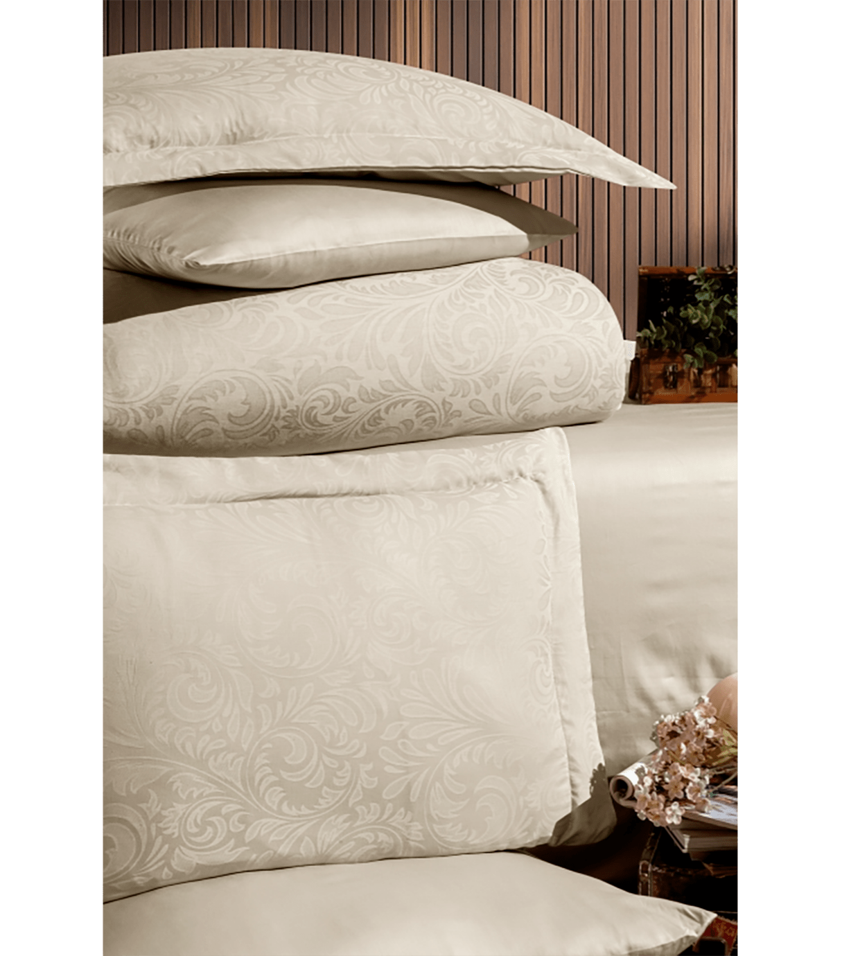 Jacquard Satin виготовлена з сатину, бавовна 100%. Сатинова постільна білизна традиційно є лідером продажів в сегменті постільної білизни. У фарбуванні використовується реактивна технологія, яка дозволяє збільшити стійкість фарбування при використанні мінімальної кількості хімічних реактивів.