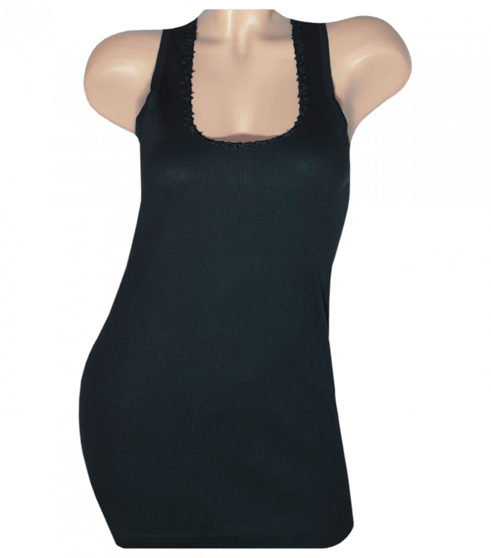 Майка жіноча на широких бретельках зі структурним малюнком у вертикальну смужку, з U-подібним вирізом горловини, прикрашена мереживом.