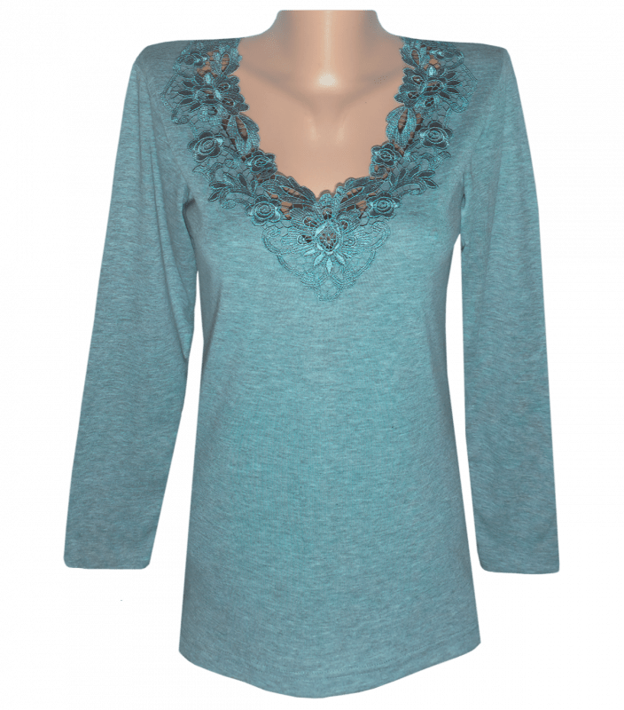 Однотонна футболка жіноча з довгим рукавом та V-подібним мереживним вирізом горловини.
