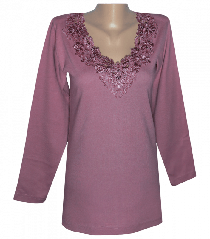 Однотонна футболка жіноча з довгим рукавом та V-подібним мереживним вирізом горловини.