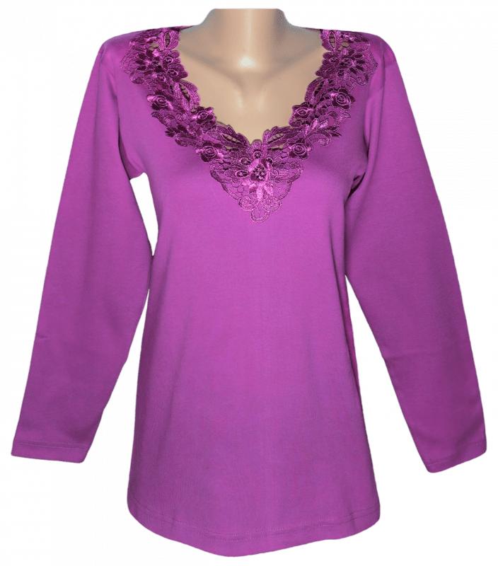 Однотонна футболка жіноча з довгим рукавом та V-подібним мереживним вирізом горловини.