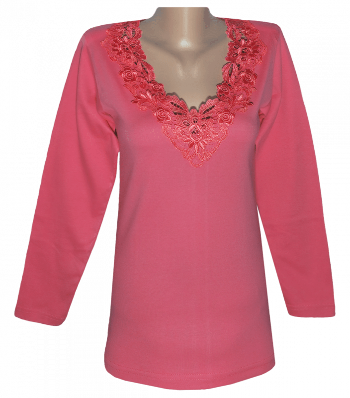Однотонна футболка жіноча з довгим рукавом та V-подібним мереживним вирізом горловини.