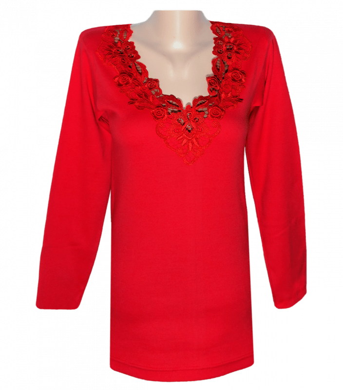 Однотонна футболка жіноча з довгим рукавом та V-подібним мереживним вирізом горловини.
