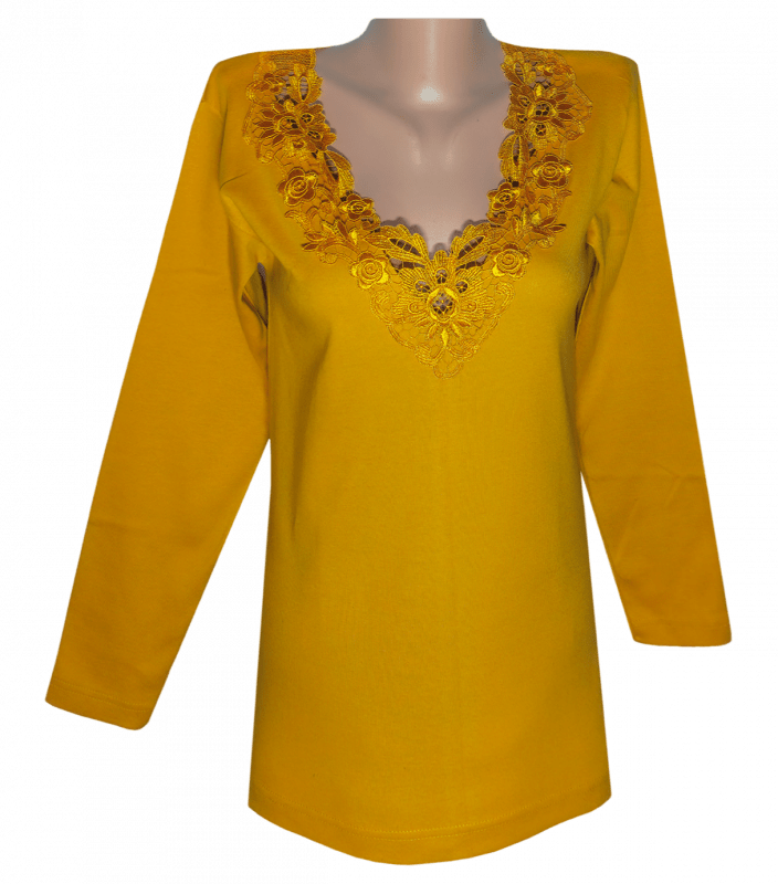 Однотонна футболка жіноча з довгим рукавом та V-подібним мереживним вирізом горловини.