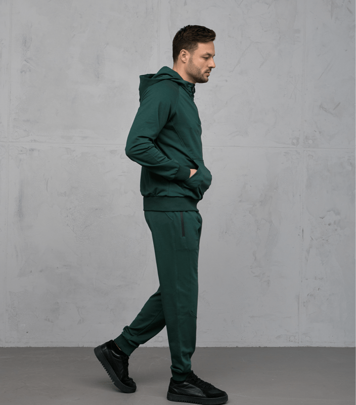 С таким спортивным мужским костюмом легкость и комфорт на прогулках или пробежках тебе будут обеспечены. В комплекте спортивные штаны идут на резинке вверху и внизу, с удобными карманами на молнии спереди вверху. В худи капюшон дополнен подкладкой и короткой молнией для удобства. Для большего комфорта в кофте спереди есть функциональные карманы.