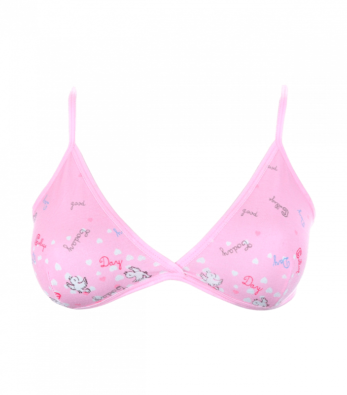 Тканевый детский бюстгальтер для девочки, на тонких бретельках с треугольными чашечками и выточками, с рисунком птички.