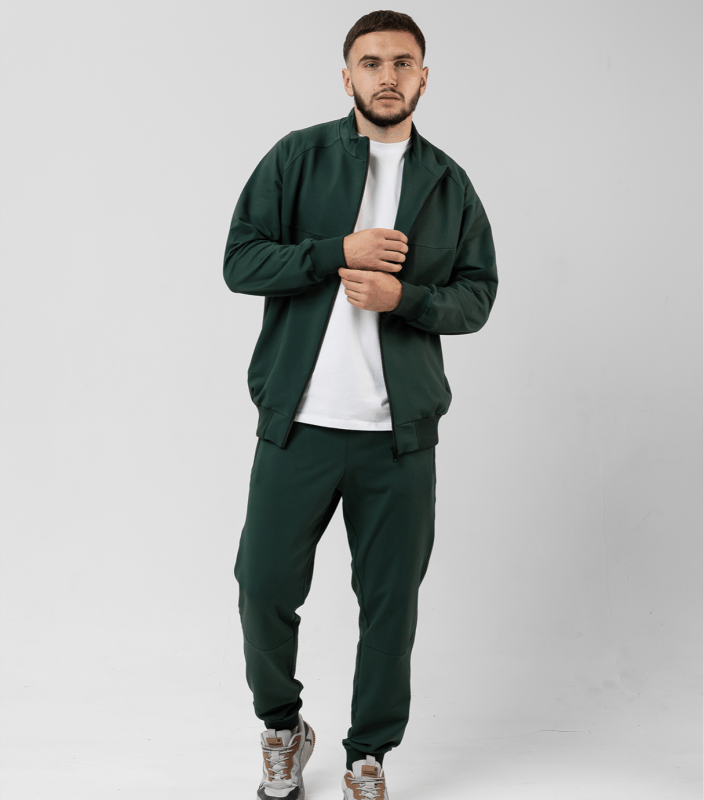Этот костюм состоит из двух частей: кофты с застежкой по всей длине и брюк с ластичным поясом. Костюм без капюшона, что делает его идеальным для тренировок в помещении или на улице в теплую погоду.