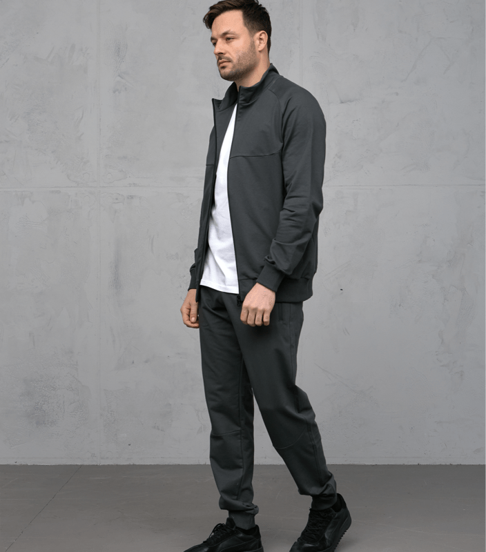 Этот костюм состоит из двух частей: кофты с застежкой по всей длине и брюк с ластичным поясом. Костюм без капюшона, что делает его идеальным для тренировок в помещении или на улице в теплую погоду.