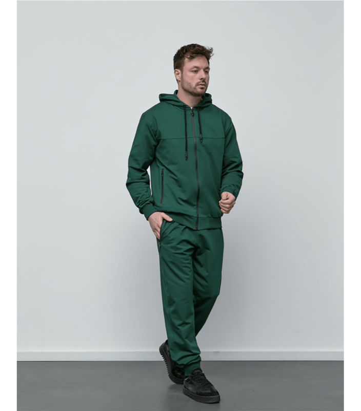 Этот костюм состоит из двух частей: кофты с застежкой по всей длине и брюк с ластичным поясом. Костюм з капюшоном, что делает его идеальным для тренировок в помещении или на улице.